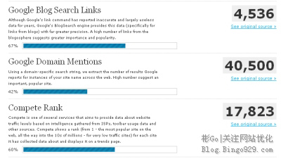 Website Grader是我平常比较喜欢使用SEO分析工具,因为它分析得很全面,可用性也很高。通过Website Grader你将得到一个关于你提交的网站的非常详尽的分析报告,报告涉及到了网站的各个部分,比如页面结构、域名信息、标题摘要信息(h1,h2,h3这些)、Google索引数量和bot最后爬行日期、RSS是否正确、Google/Yahoo/Alexa/MSN上的反向链接数、Technorati排名、del.icio.us的收藏数、Alexa的排名情况和Google PageRank值。并且还会对提交的网站进行打分及网站出现的问题的修改建议。通常Website Grader所提出来的修改建议是很有价值的,而且能详细的致命问题出在哪,如何才能解决这样的问题。