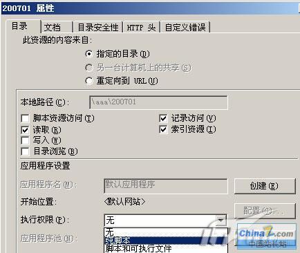 单击该设置窗口中的“目录”标签,打开如图3所示的标签页面, 在该页面的“应用程序设置”处,单击“执行权限:”右侧的下拉按钮,从随后弹出的下拉列表中选中“纯脚本”选项,并单击“确定”按钮,那样的话指定目录中的脚本文件才能被网站服务器执行,而对于那些不属于脚本类型的文件都不会被执行。按照相同的操作方法,我们打开网站中其他目录的属性设置界面,并在该界面中将其他目录的应用程序执行权限设置为“无”,那样一来其他目录中的脚本或者普通文件都不会被网站服务器系统执行的。